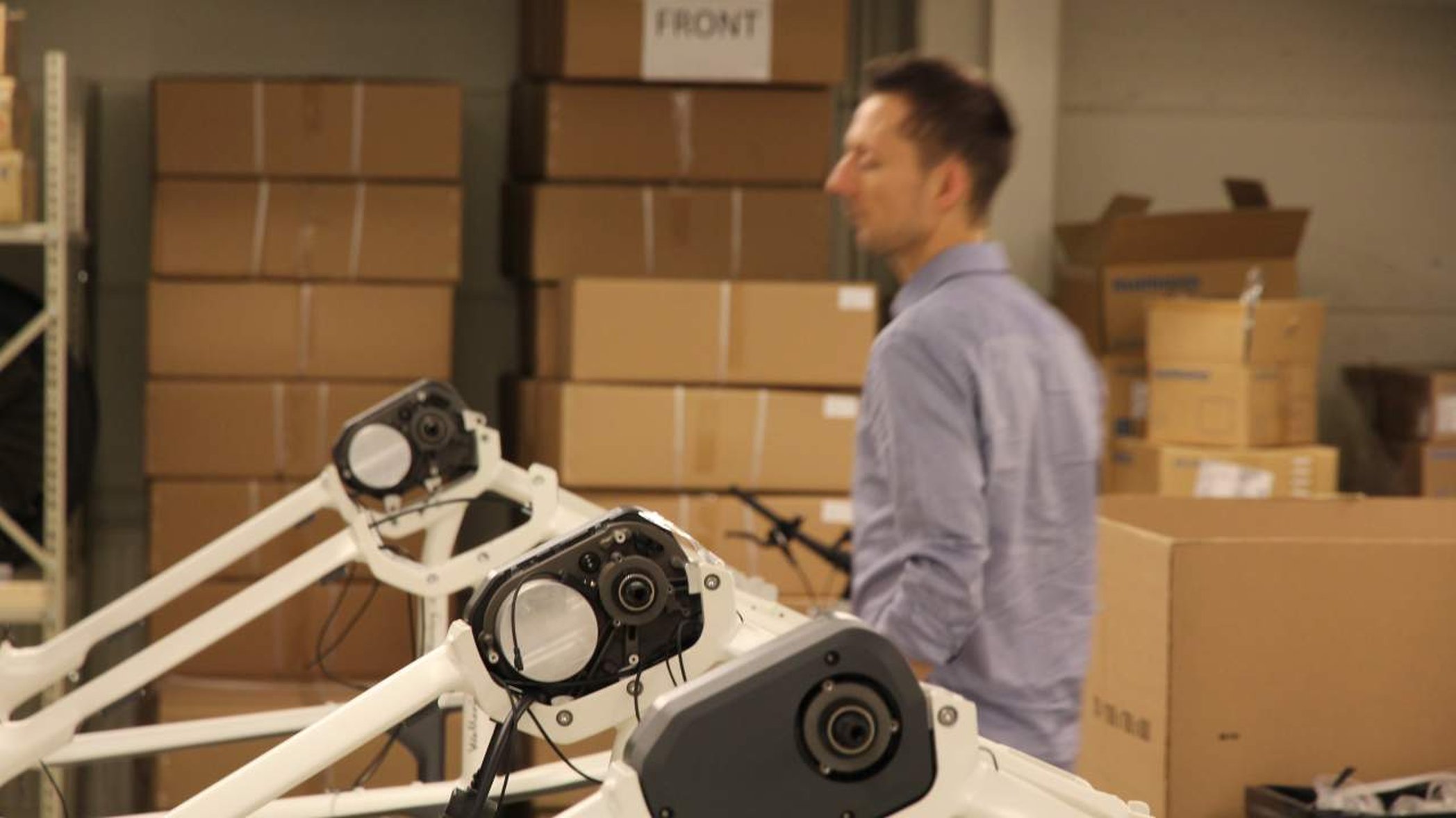 Vi går vidare ut på det stora lagret för Ecocyklar. I ett hörn av lokalen sker byggandet av Wallräng M:01. Motorer ligger i lådor och färdiga ramar står intill.